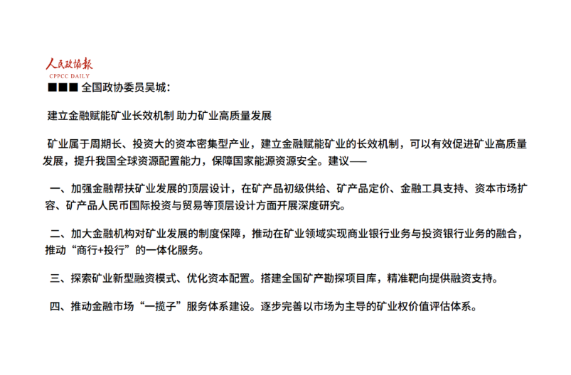 全國政協(xié)委員吳城:建立金融賦能礦業(yè)長效機制 助力礦業(yè)高質量發(fā)展