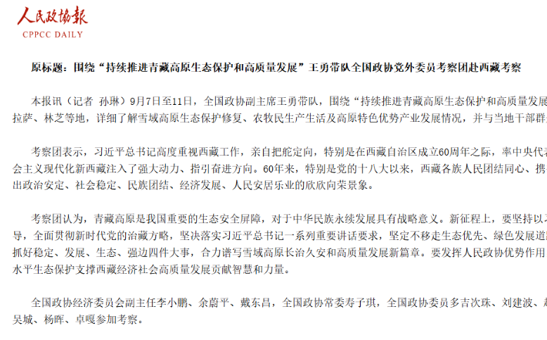 9月7日至11日,全國政協(xié)副主席王勇帶隊,圍繞“持續(xù)推進青藏高原生態(tài)保護和高質量發(fā)展”...